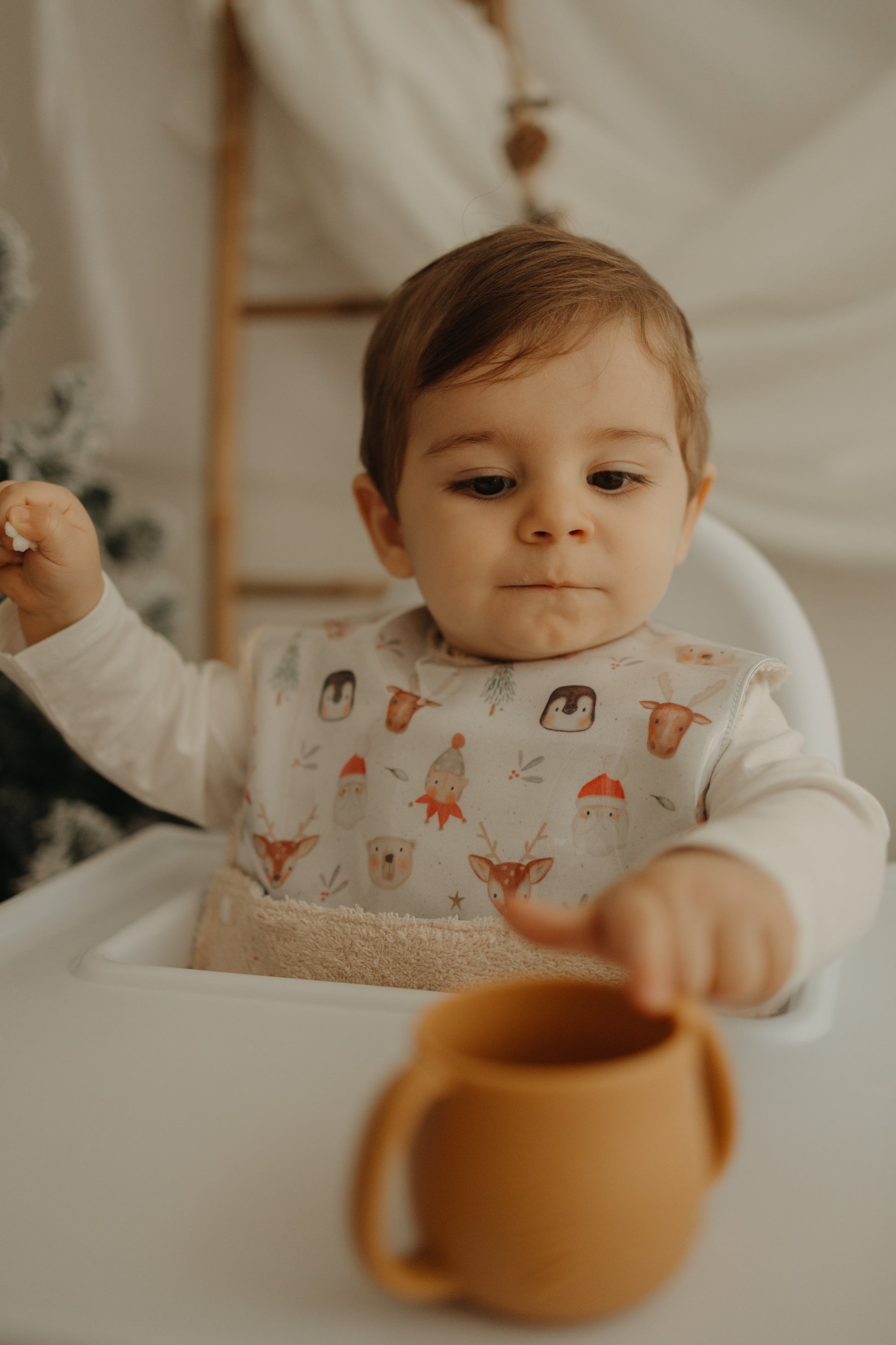A babete de refeição conta com 3 camadas: o plástico na parte da frente que ajuda imenso na limpeza no dia-a-dia, o tecido com o padrão super fofo e amoroso natalício e o turco 100% algodão que está em contato com os nossos pequeninos. O turco é macio, protegendo o bebé de qualquer sujidade.