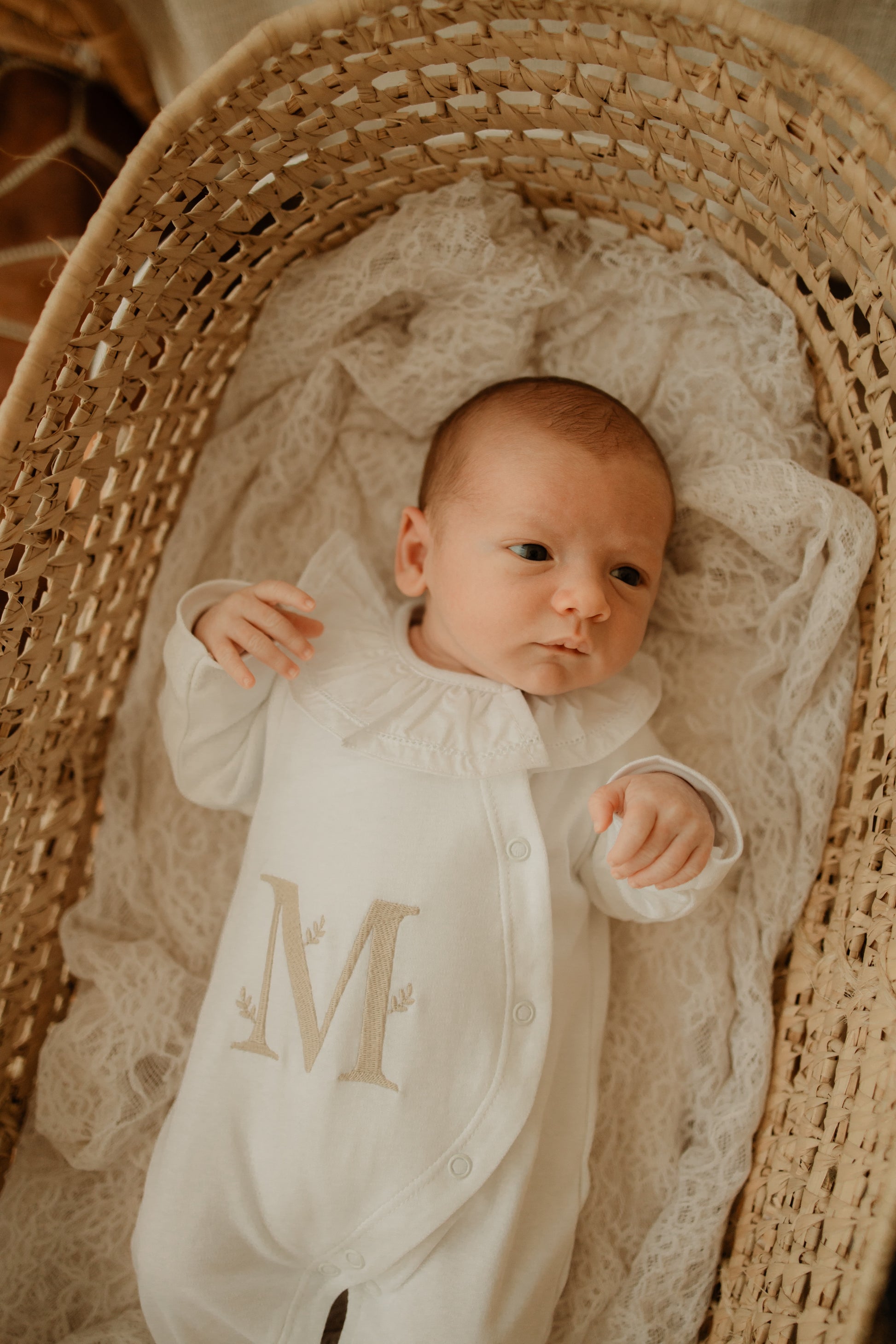 O nome bordado e o folho delicado na gola acrescentam um detalhe cuidado e intemporal, tornando esta peça especial sem excessos.