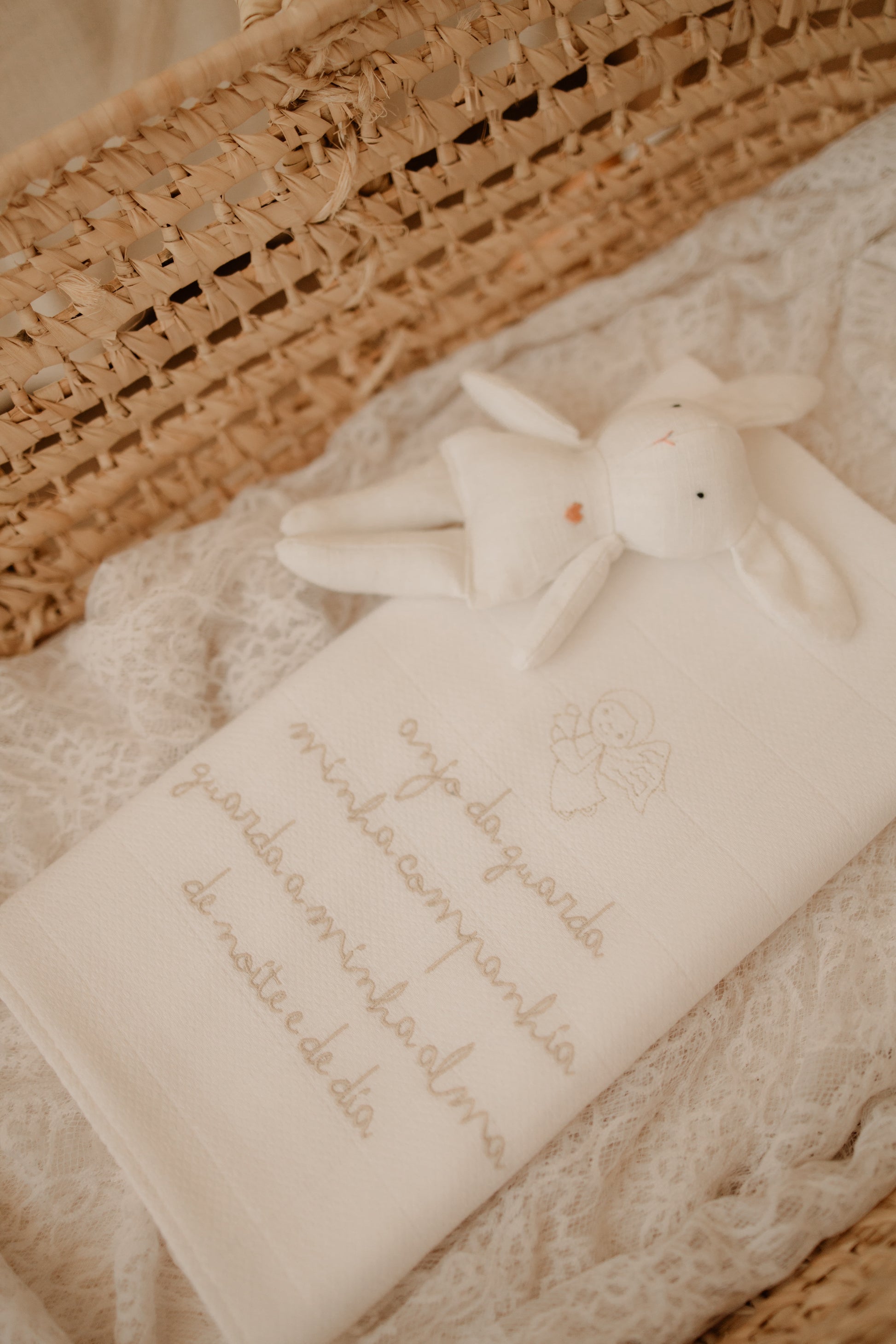 Feita em algodão biológico, esta fralda de pano dupla é macia, respirável e delicada como o toque da pele do bebé. Bordada com a oração do anjo da guarda, torna-se numa peça única e muito especial.