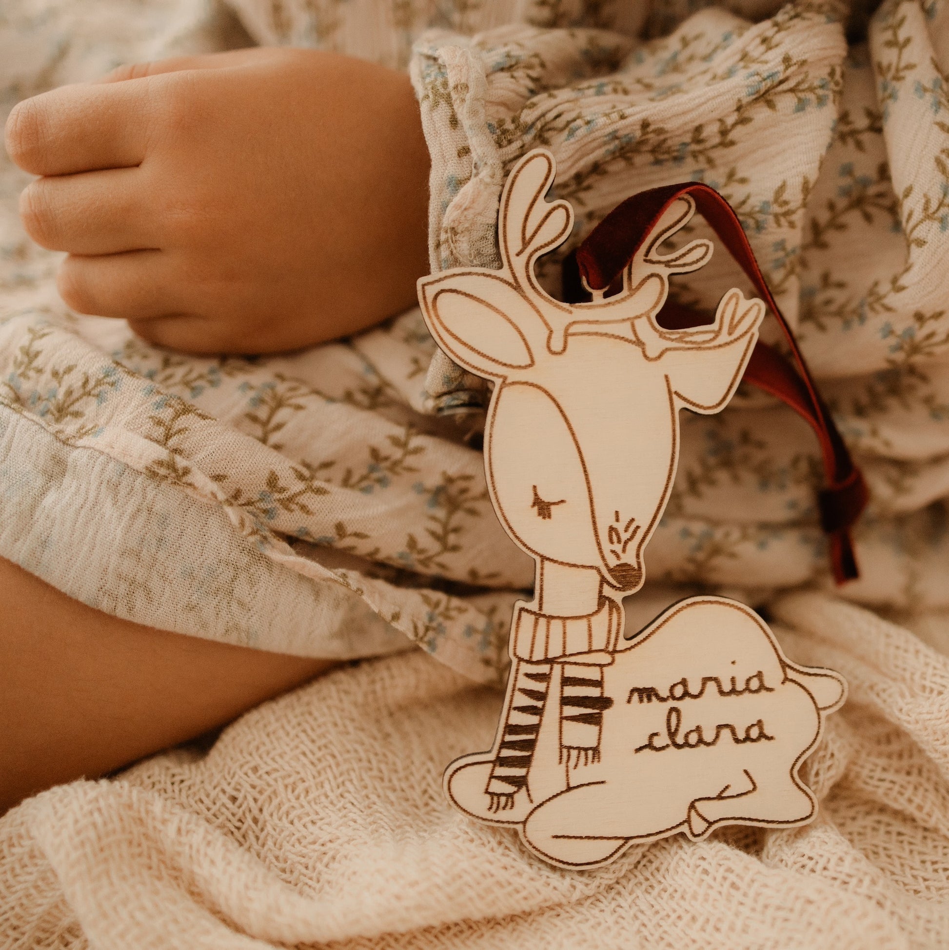 A magia do Natal ganha um toque suave e delicado com esta rena adorável, gravada e cortada em madeira natural. Com o nome da criança personalizado, este ornamento traz consigo a ternura e a beleza do Natal de forma minimalista.