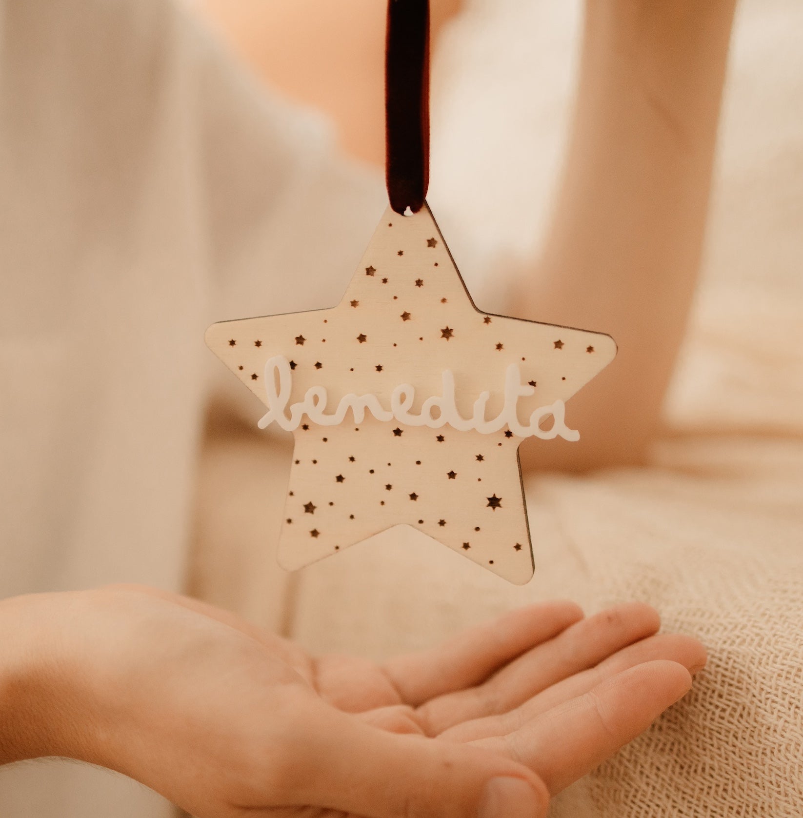 Este ornamento em madeira natural, em formato de estrela, é delicadamente gravado com pequenas estrelinhas e personalizado com o nome da criança em acrílico branco.