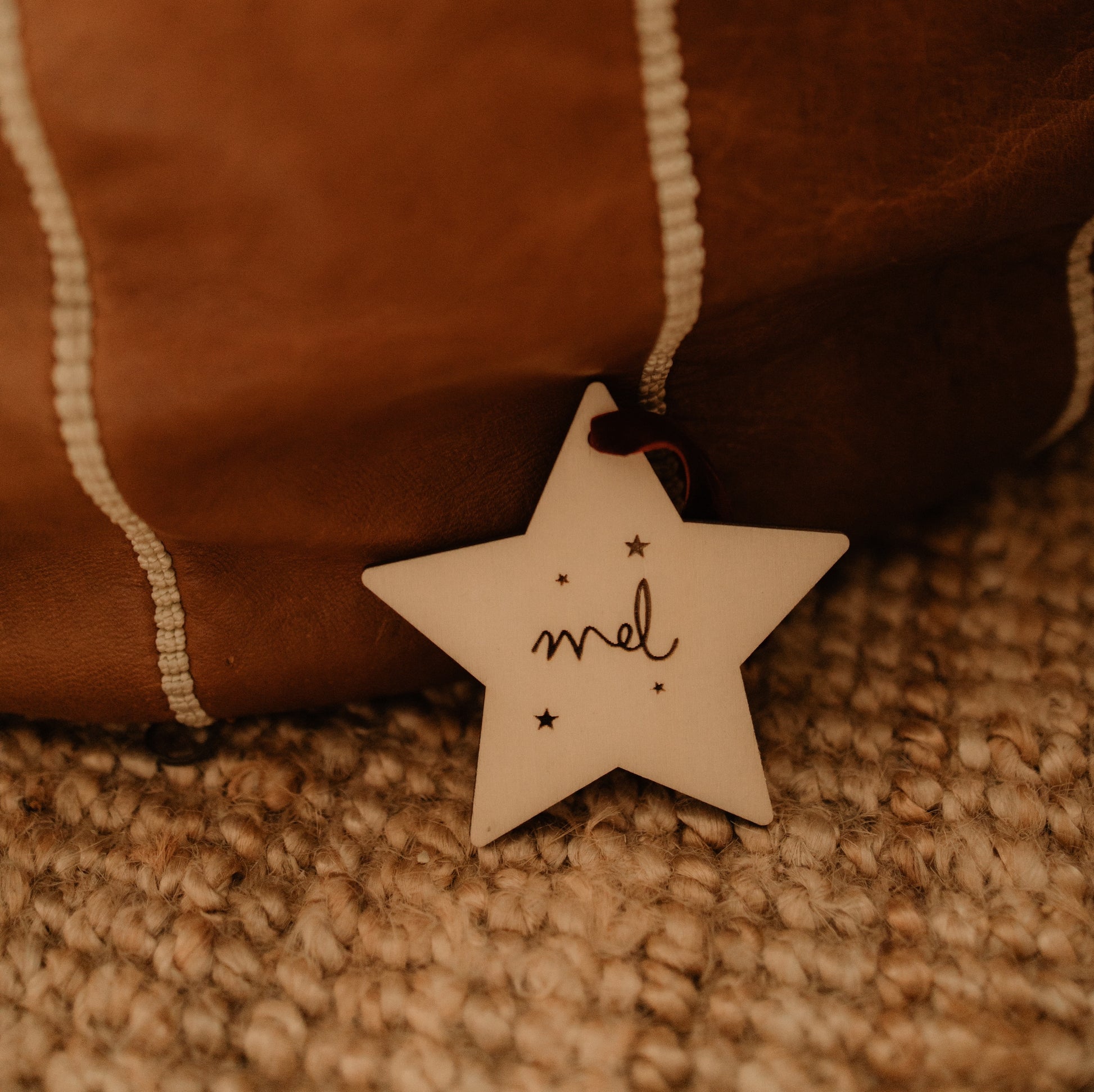 Com um design simples e delicado, este ornamento em madeira natural é uma forma intemporal de guardar o nome da criança.